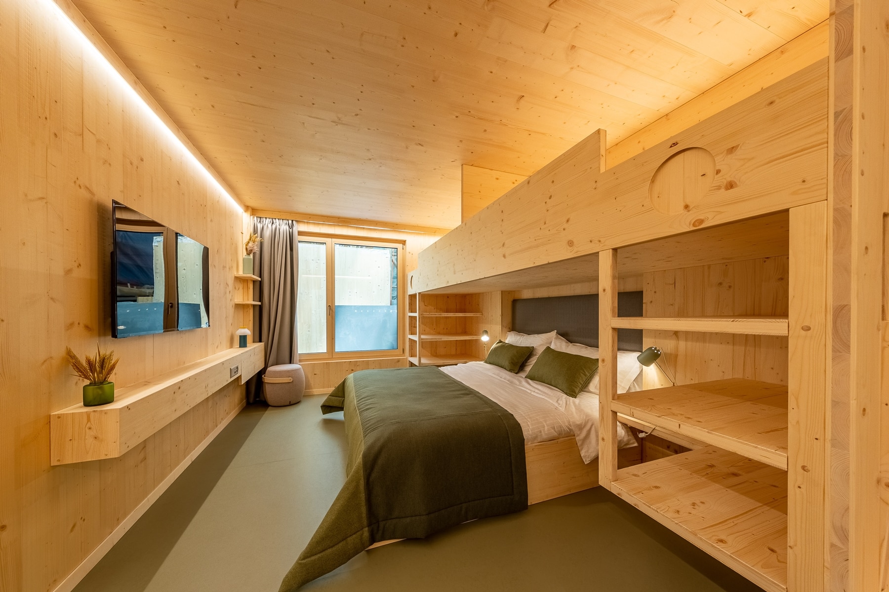 Located at the start of the Haute-Nendaz gondola, the Mad Mount Hôtel benefits from direct access, on foot, to all the resort’s amenities. Built according to an innovative concept of prefabricated modular wooden rooms produced by regional players, it affirms a strong commitment to sustainability. With its 28 rooms, it offers a serene, warm space, where comfort and Alpine authenticity meet.